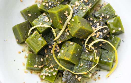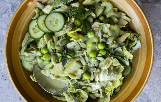 Bezelyeleri 5-6 dakika haşlayın ve buzlu suda şoklayın. Kabakları Lurch mandolinin en ince dilimleyicisinde dilimleyip hafif tuzla ovup beklemeye